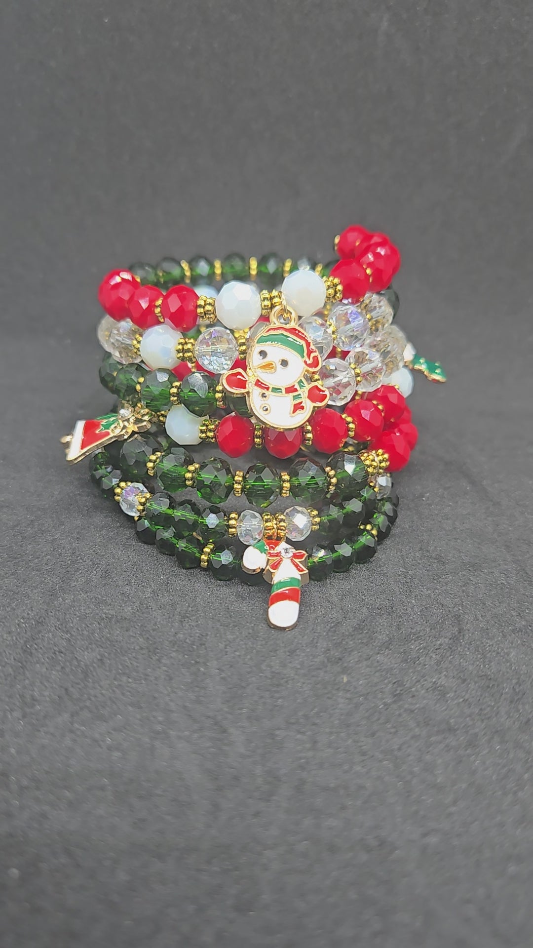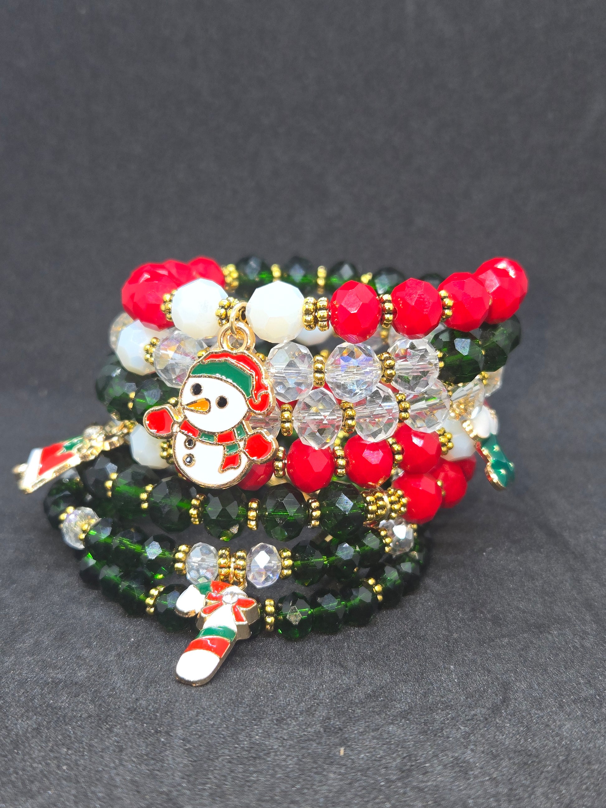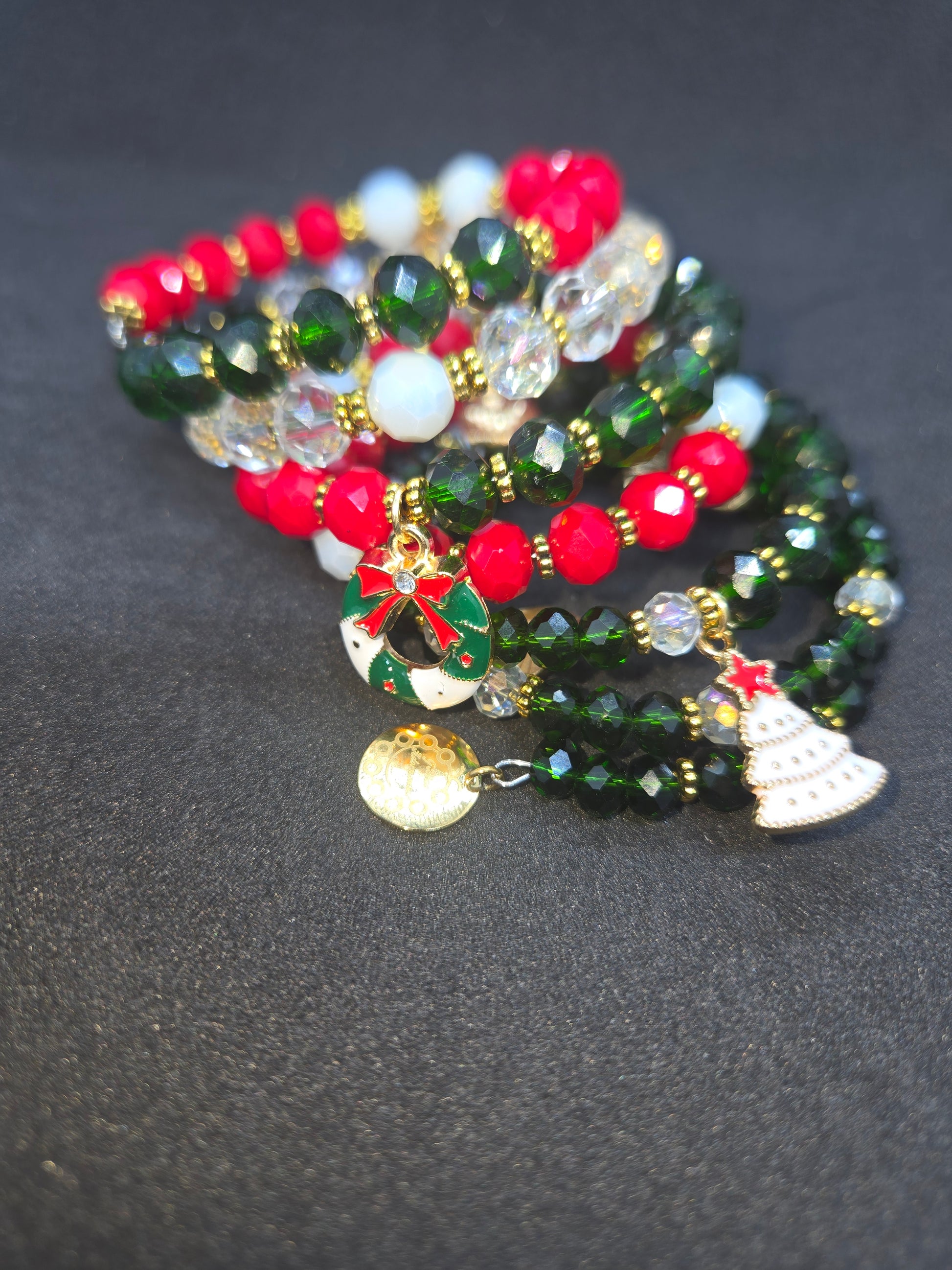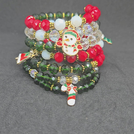 This wire-wrapped holiday bracelet blends rich red, deep evergreen, and icy crystal beads with gold accents — finished with playful charms that bring Christmas joy to every outfit. A perfect piece for holiday photos, brunches, gift exchanges, or adding a little magic to your everyday look.