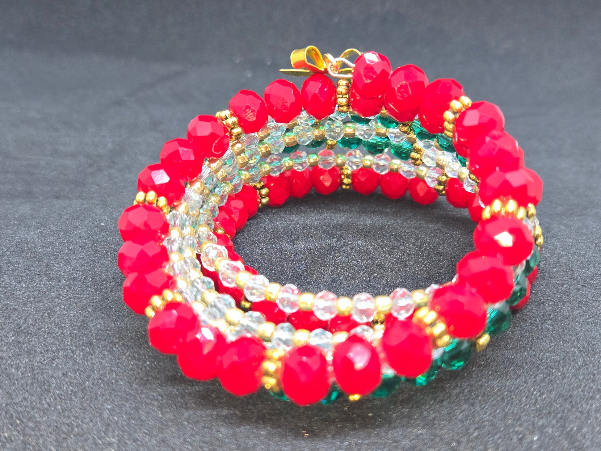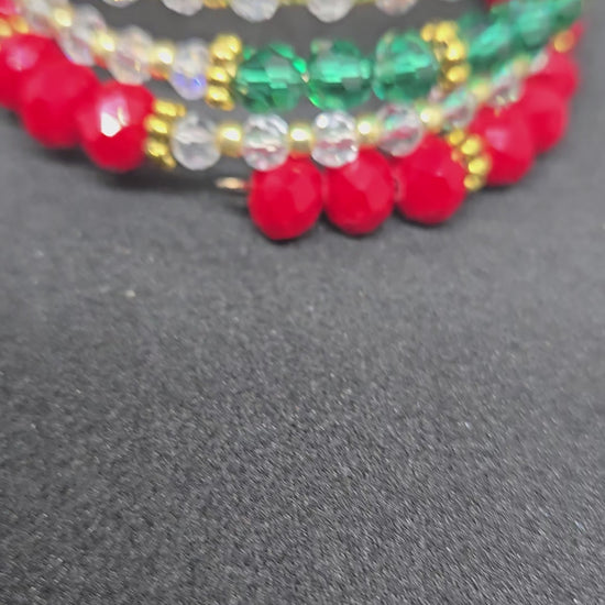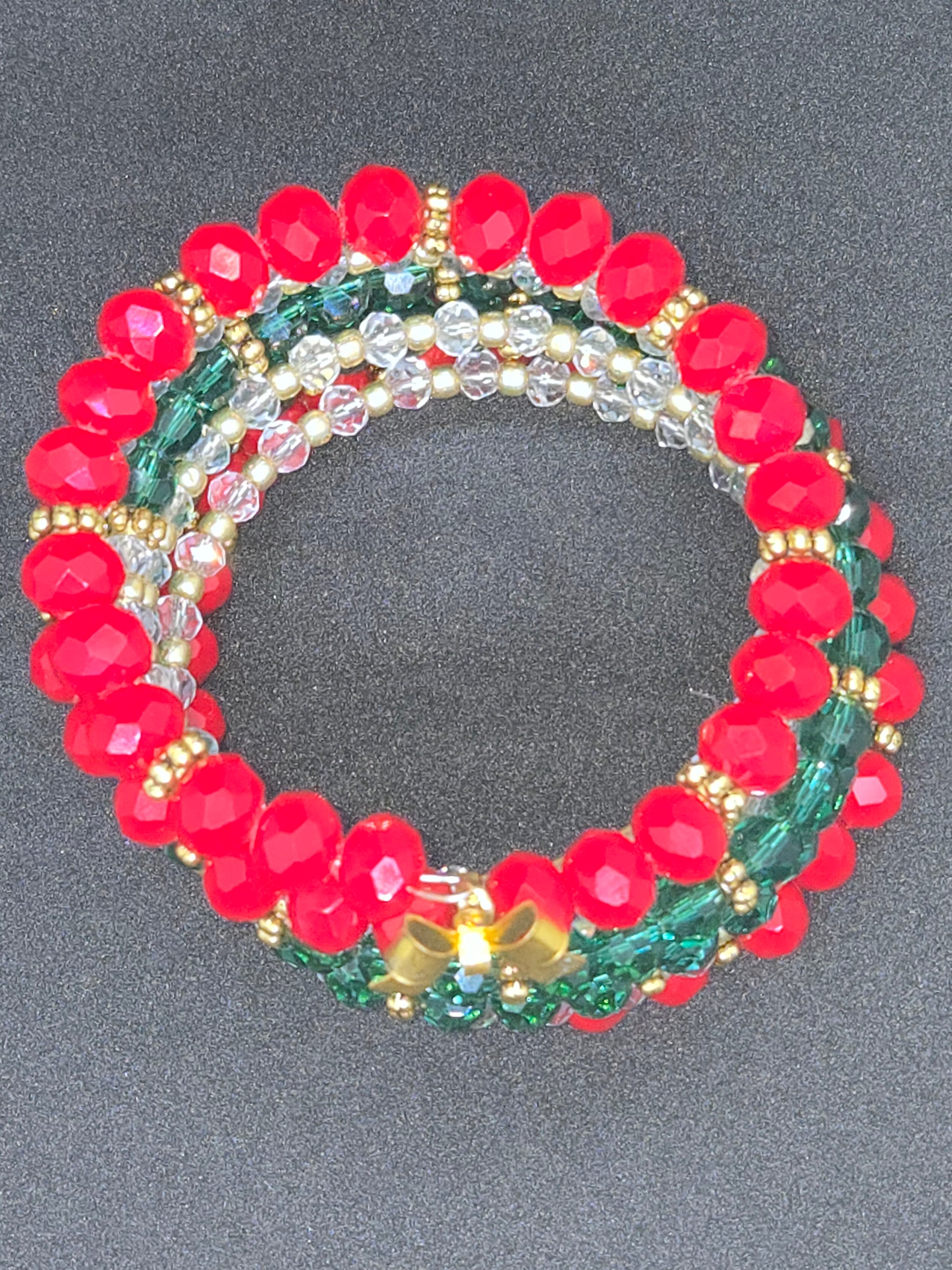 Cebrate the season with the Golden Bow Holiday Wrap Bracelet , a handmade statement piece featuring radiant red, emerald green, and gold beads accented by a delicate bow charm.