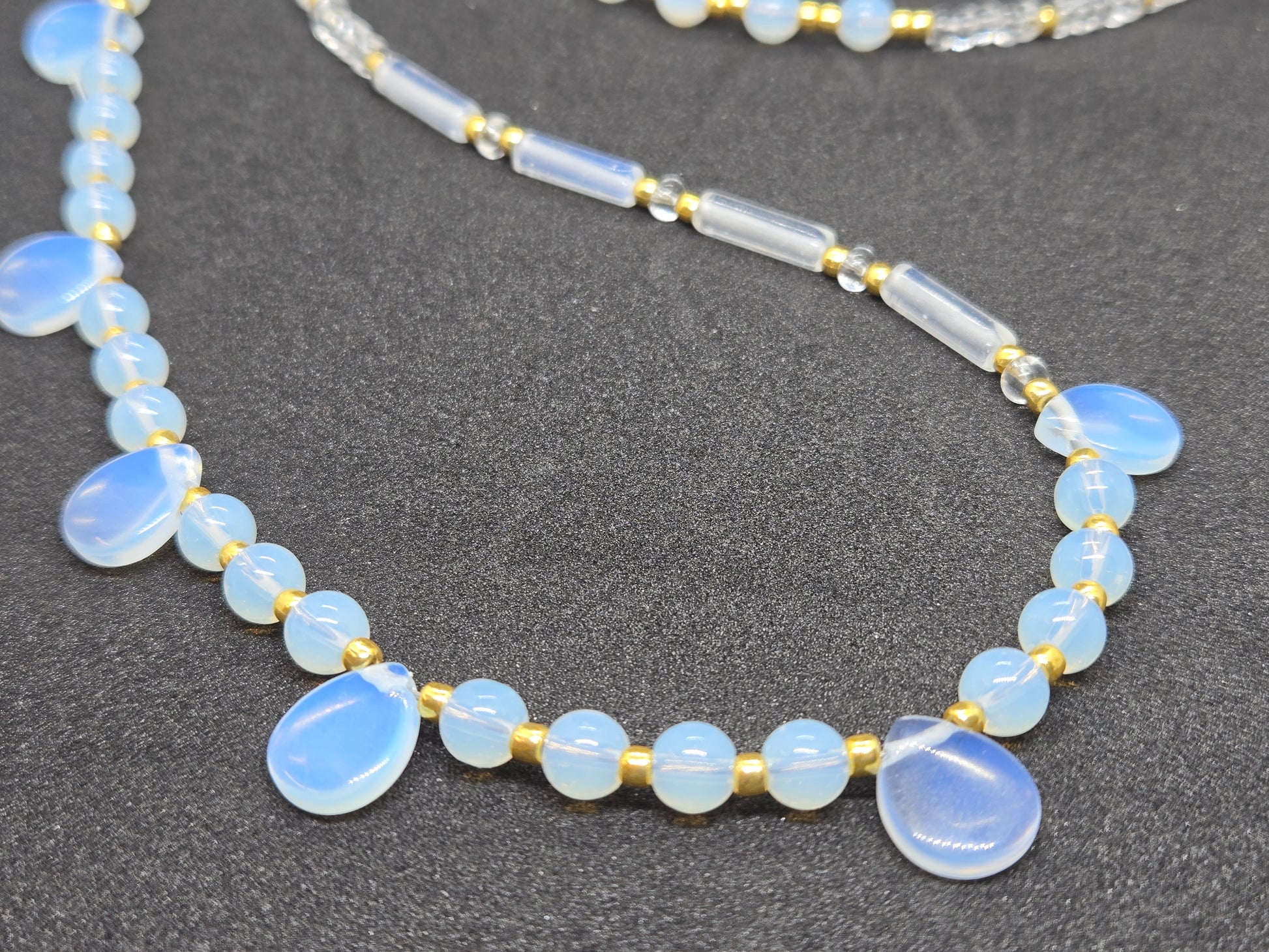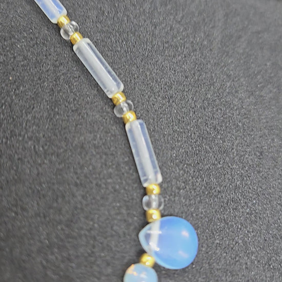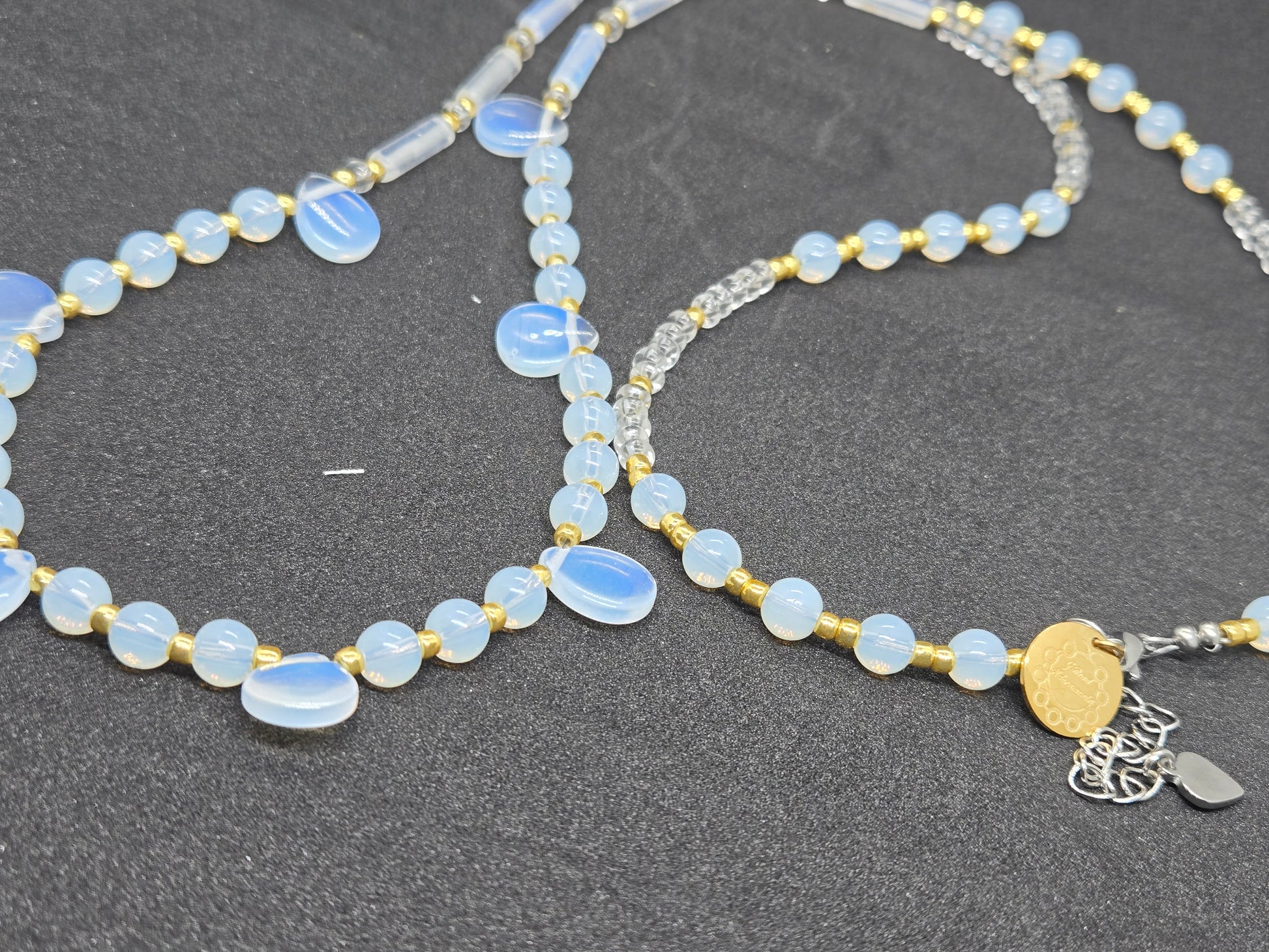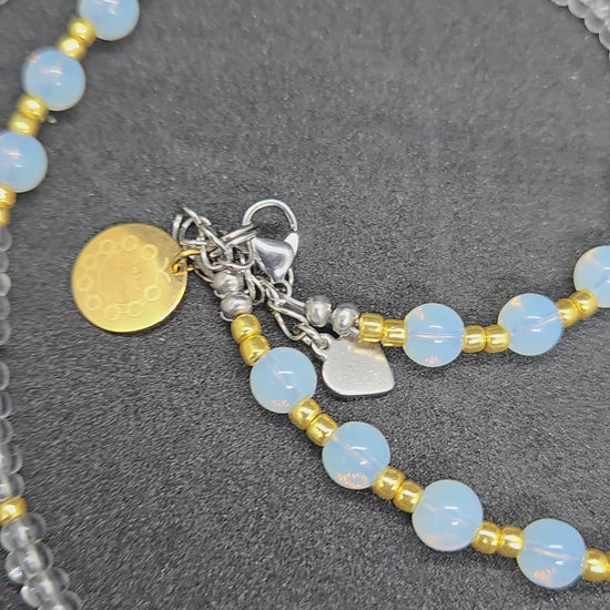 Each piece is handmade to order with stainless steel, glass, and semi-precious Opalite stones. Finished with a 2-inch extender for an adjustable and removable fit, this adornment moves with you as you glow through life.