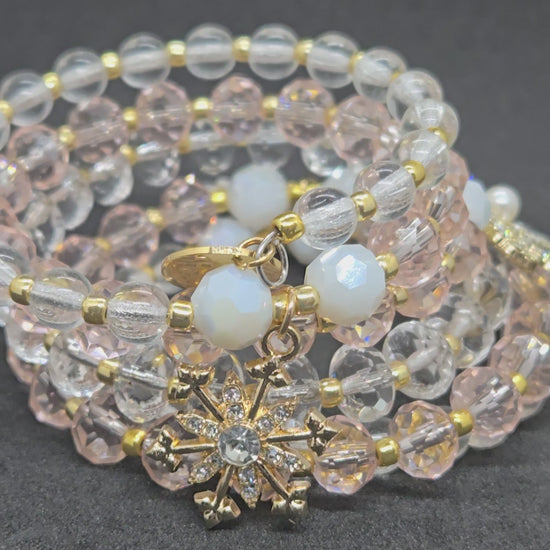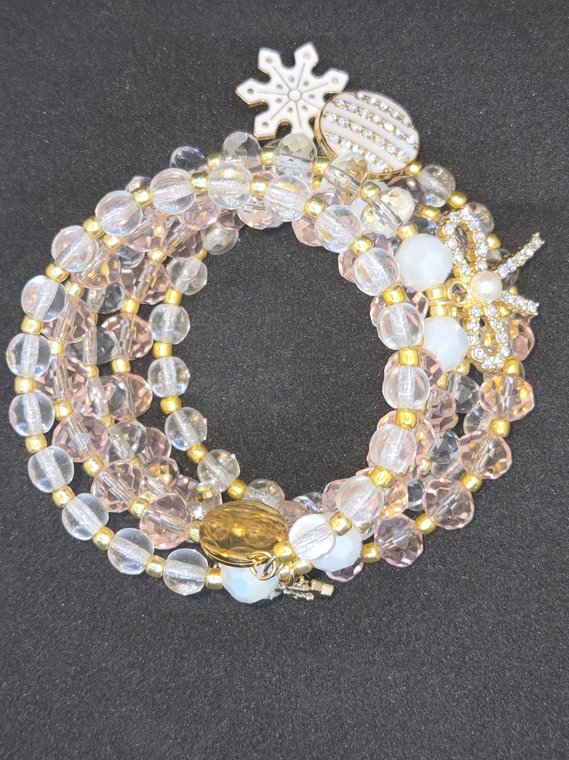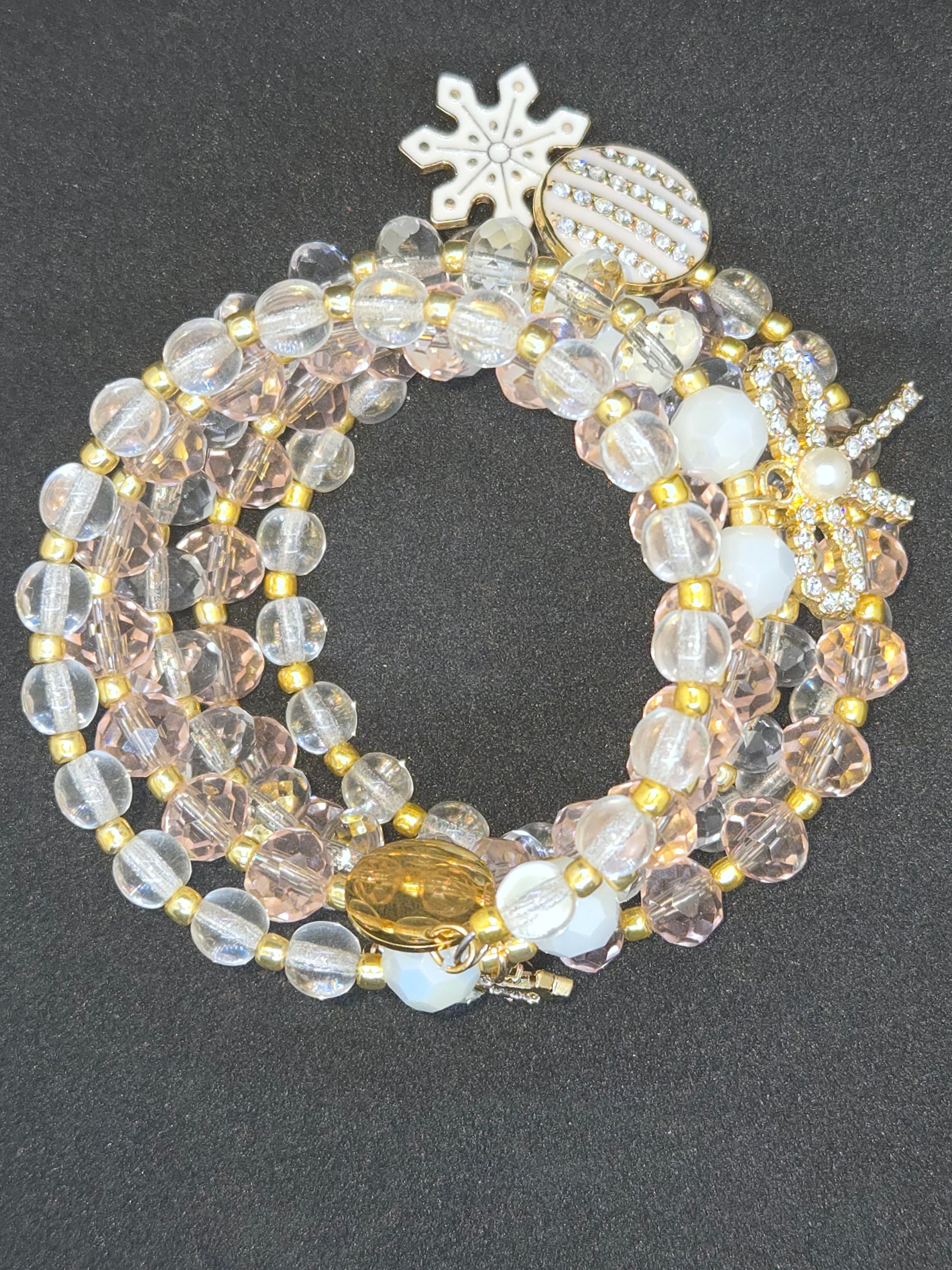 This blush and crystal wrap bracelet mixes warm pink tones, frosted clear beads, gold accents, and chic holiday charms for a subtle yet stunning winter look. Perfect for holiday parties, thoughtful gifting, or treating yourself to something beautiful this season.